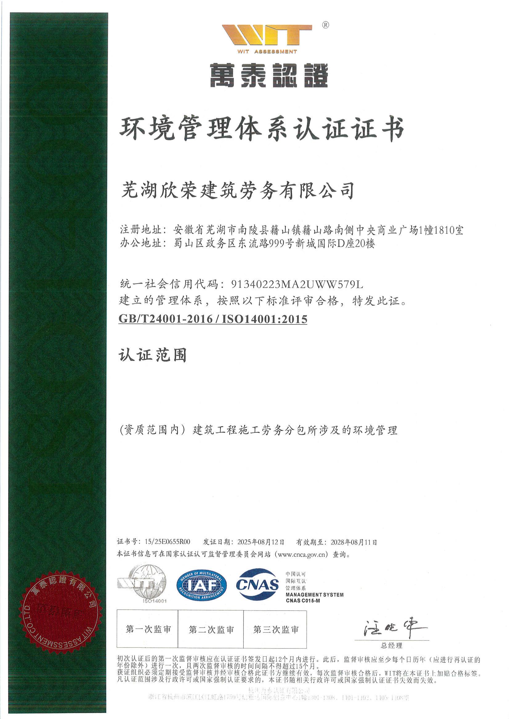 欣荣劳务获“环境管理…
